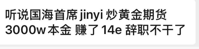 近日,有一则简短而诱人的市场消息传开:“听说国海首席jinyi炒黄金期货,3000w本金赚了14e,辞职不干了”。该消息迅速在投资圈发酵,并指向了国海证券(000750)原固定收益首席分析师靳毅。