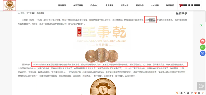 另有部分酒企攀附“王秉乾”名义进行注册和宣传。2022年7月注册于茅台镇的“贵州省仁怀市三官楼王秉乾酒业(集团)有限公司”,法人代表为王德强,其官网不仅出现“王茅创始人”字样,还宣称“1915年获巴拿马国际博览会金奖,在茅台国酒文化园专门立有王秉乾的塑像以纪念其贡献”。贵州百年黔庄酒业集团有限公司官网也宣称,传承百年祖业,遵循家传秘酿,王茅世家秘传“荣霄散”由始祖石荣霄所创,经“王茅”品牌创始人王秉乾优化,由王秉乾嫡传后人于1983年重建,且“1915年荣获巴拿马万国博览会金奖”。