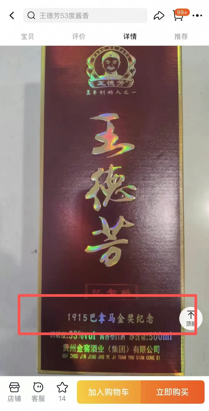 此外,贵州金窖酒业(集团)有限公司将王德芳宣传为“王茅创始人之一”,其在淘宝店铺“星辰酱香白酒体验馆”销售的“王德芳纪念版”白酒,瓶身印有“1915巴拿马金奖纪念”“王德芳王茅创始人之一”等字样。建厂于茅台镇的贵州黔王酿酒有限公司,门楼刻有“王茅有机烧坊”红色大字,该公司与金窖酒业法人均为王正礼,官网宣传王正礼为“王茅第六代传承人”,其淘宝店还称2012年王德芳传承人王正礼在祖上烧坊基础上成立了公司。