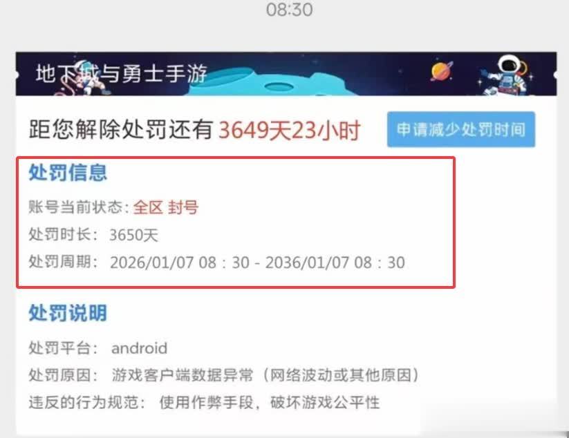 有玩家表示自己被封号了,而且一封就是十年。这名玩家直接被封3650天,处罚力度很大,看得出这次策划是认真的。因卡漏洞被封号,基本上申诉也没用。