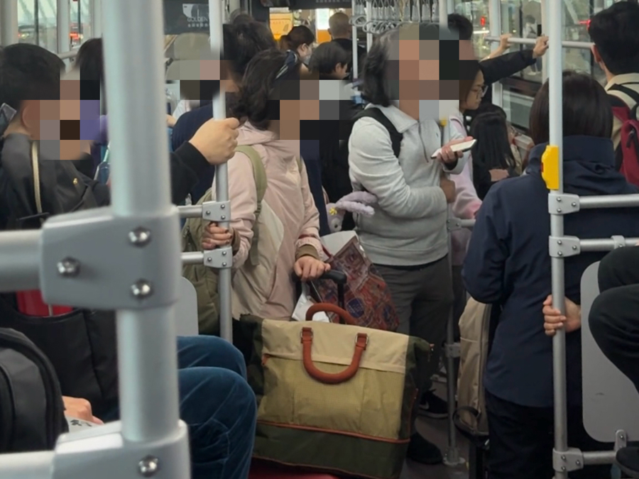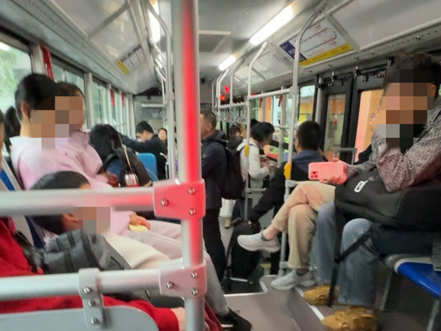 乘客吴女士带着一家老小回老家。她告诉记者,他们第一次尝试来P4停车场,一家要出行2天半,停这边费用能比周边其他停车场便宜近一半。他们将2个大的行李箱放在站立区,由长辈在那儿看管,“台阶上座位区的空间有限,没必要把行李搬上来。”穿梭巴士将会转弯经过2个地面十字路口,转向是有一定侧倾。后来的乘客与行李挤在一道,需要一手捏着扶手,一手拉着行李,避免行李滚动。