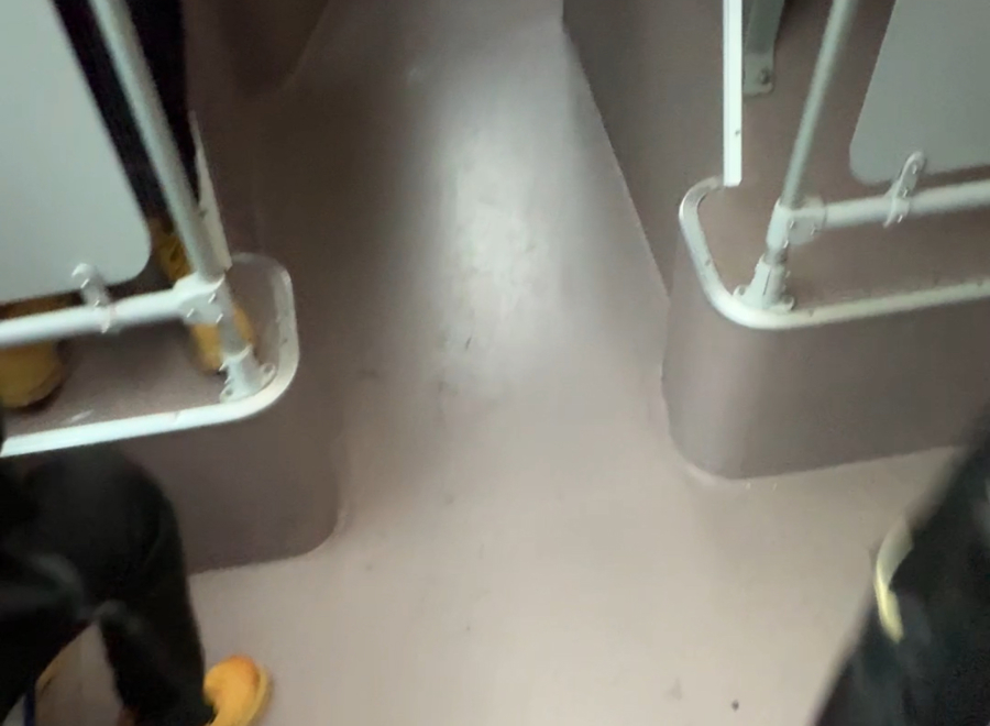 抵达T1航站楼时,不少乘客纷纷准备下车。此时一名位于后车厢门附近的乘客拿着行李箱正巧打电话,他慢慢挪动往前,让出通道,方便其他乘客下车。同时,上来的乘客(即前往停车场的)重新填满了站立区。穿梭巴士继续驶向T2航站楼,在下车客流的冲击下,站立在车门附近的两位携带行李的旅客进退两难,一定程度影响了下车效率。这解释了在客流高峰,有乘客会遇到“上不去,下不来”的情况。